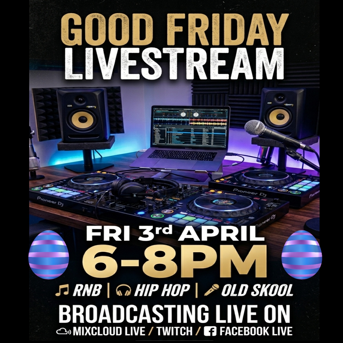 Tune in for the next for tonights ‘Easter Good Friday’ Livestream 6-8pm (GMT). Send over your shout outs & messages in the live chats, from: Twitch FACEBOOK LIVE – MIXCLOUD. 2 hours of Hip Hop RnB Dancehall & Old Skool.