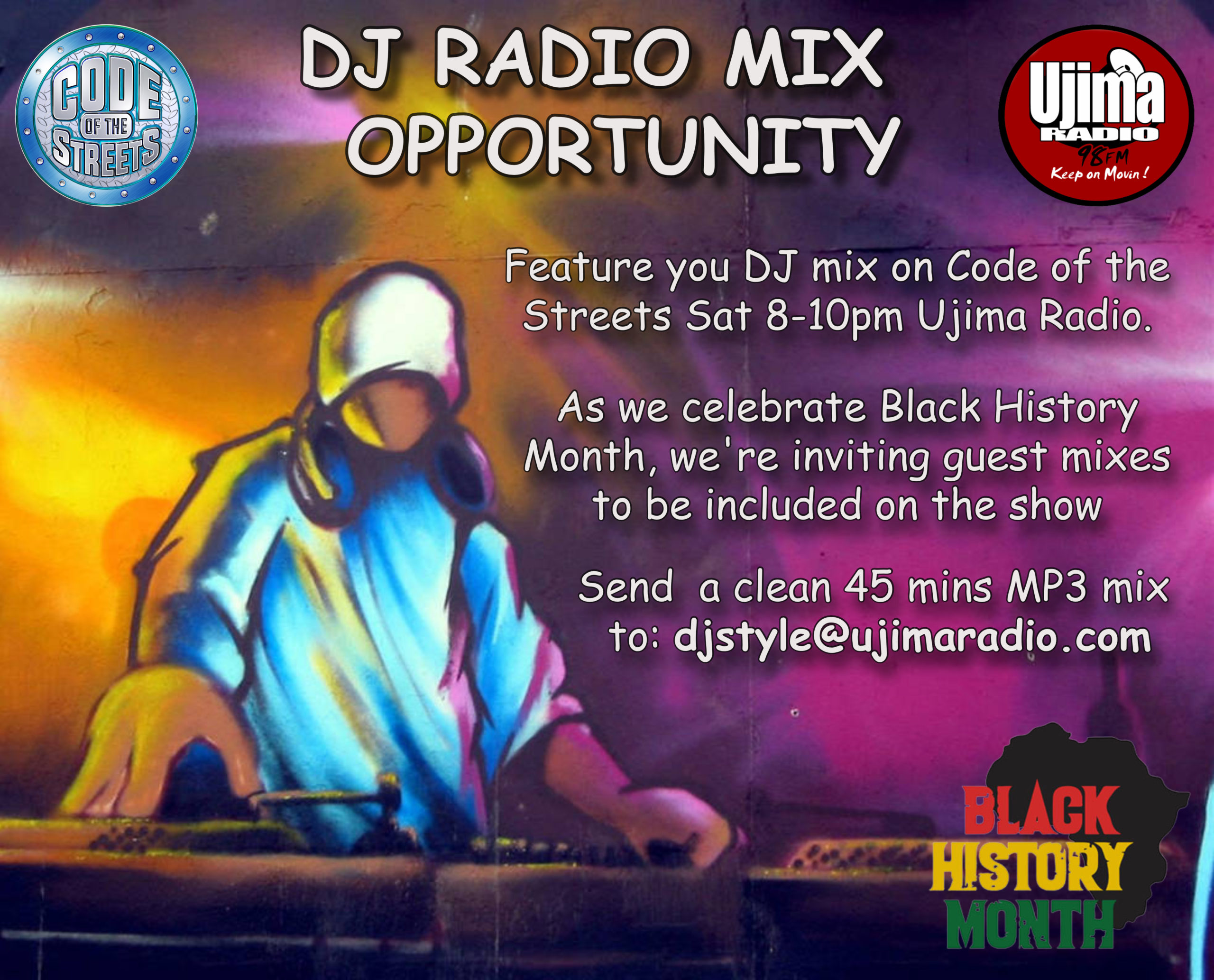 During October celebrating Black History Month, Code of the Streets radio show is inviting guest DJ’s to submit mixes to be included on the show. The playlist must be inspiring, conscious, empowering & celebrate Black Excellence. Send over your MP3 clean edit, 45 minute mix to: djstyle@ujimaradio.com.