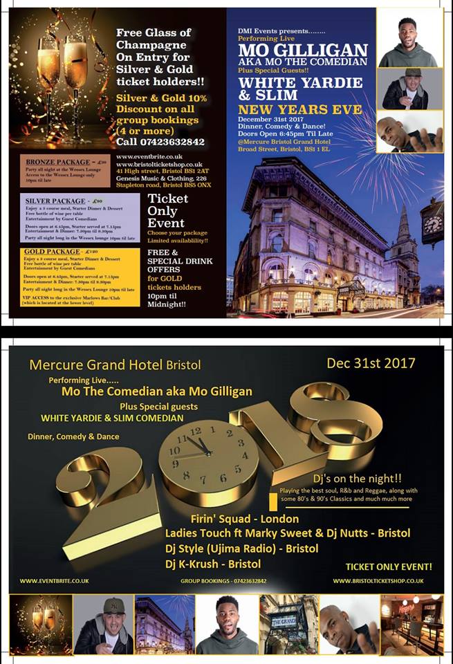 DMI Events presents this years 1st annual NEW YEARS EVE (DCD), Dinner, Comedy & Dance event on December 31st 2017 at The Grand Mercure Hotel Bristol. Guests will enjoy a 3 course meal, with live performance from MO GILLIGAN AKA MO THE COMEDIAN plus SLIM COMEDIAN & WHITE YARDIE followed by the dance & after party to see you into the new year.