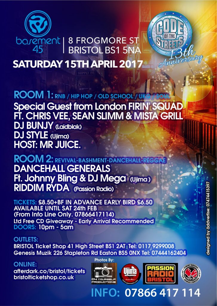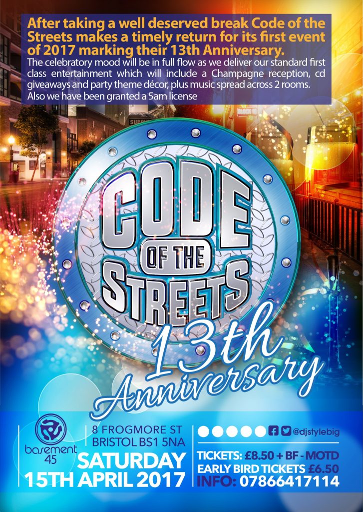 Code of the Streets celebrate it’s13th Anniversary on Sat 15th April 2017 @ Basement 45 – 8 Frogmore St Bristol BS1 5NA. Doors 10pm – 5am champagne reception, Ltd free cd’s Tickets £8:50 more on the door. Early Bird tickets available until 25th Feb price only £6:50.