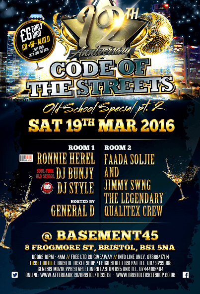 This year marks Code of the Streets 12th Anniversary, firmly established as one of Bristol’s must nights out, when it comes to RnB Dancehall, Old School, Hip Hop, Rare Grooves, & modern day classics. Come celebrate this landmark occasion with some of the pioneer DJ’s in the business and who will be making their first ever appearance at this event. So expect to hear some of your all-time favourite anthems & more as we dance the night away