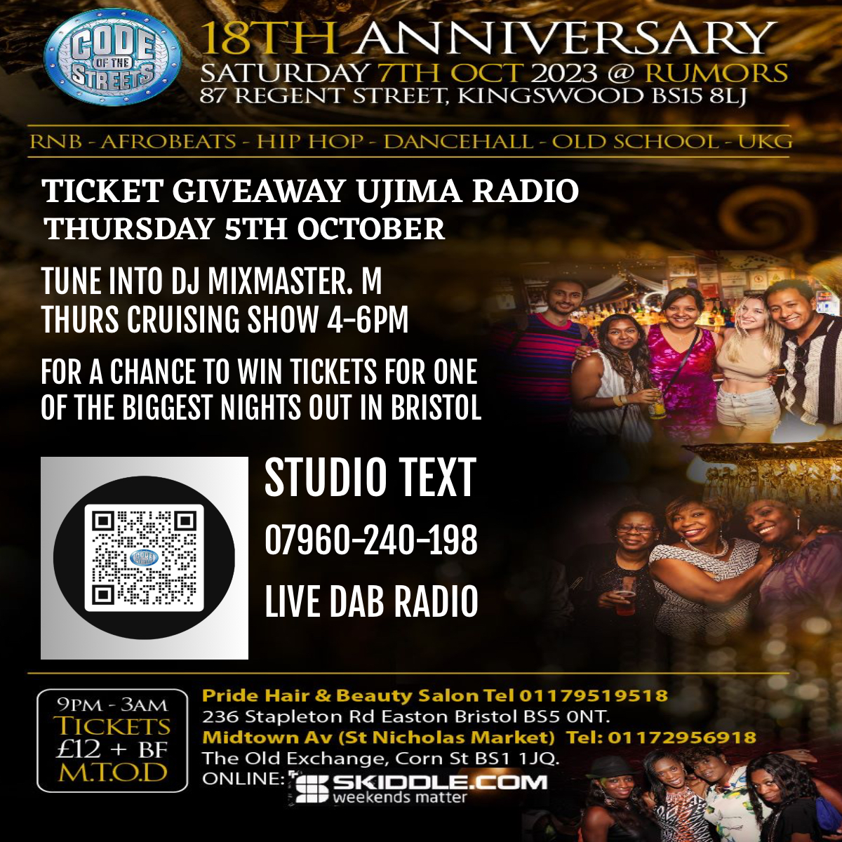 Competition Time On the Cruising Show 4-6pm with Mixmaster – M on Thurs 6th Oct, you’ll have a chance to win tickets for Code of the Streets 18th Anniversary @ Rumours Lounge & Bar 87 Regent St. Kingswood, on Sat 7th Oct. For entries contact the Studio Text Line on 7960-240-198 Tune in online, DAB & on 98fm.