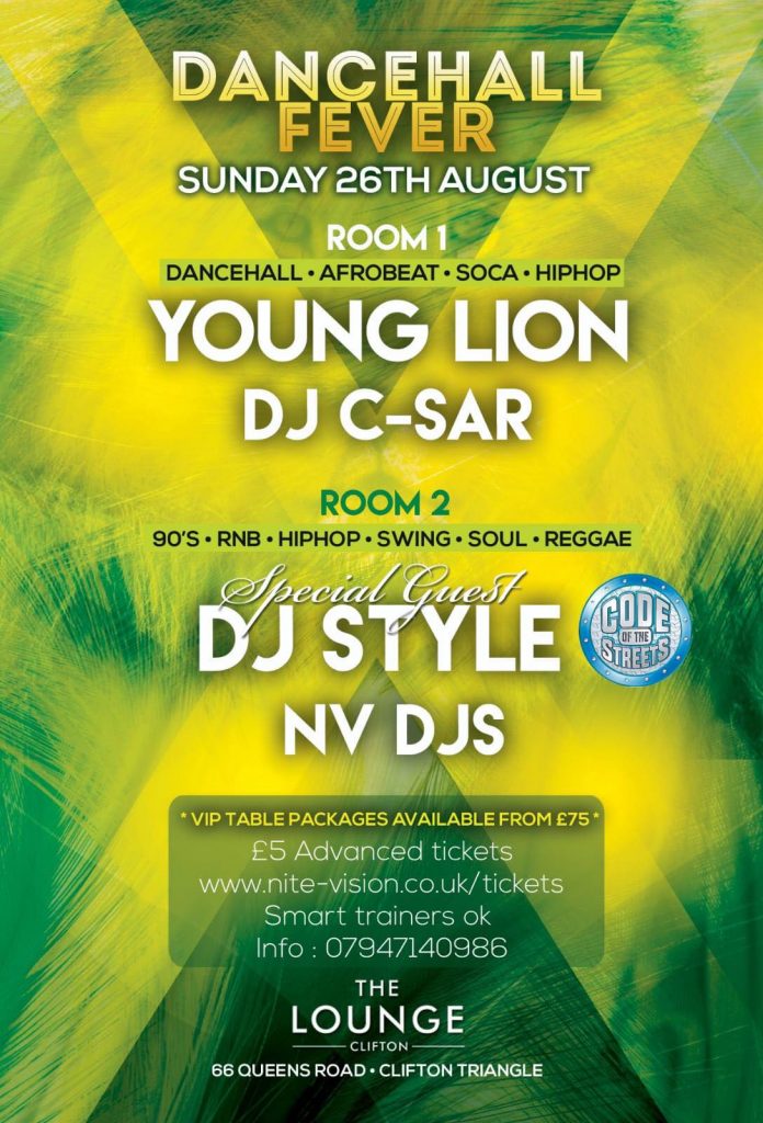 Bank Holiday Sun 26th Aug The Lounge, Clifton, Bristol brings you two room of entertainment. Room 1 playing the best in #Dancehall #Afrobeat #Soca Room 2 #90s #RnB #Swingbeat #Soul #Dancehal. Tables & VIP available on the night, tickets online price only £5 https://dancehallfeverbristol.eventbrite.co.uk