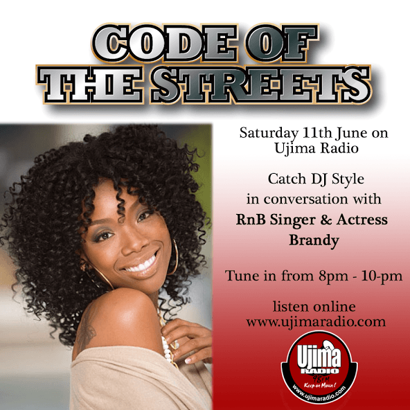 This weekend Saturday 11th June 2016 on Code of the Streets DJ Style will be in conversation, with international RnB artists and actress Brandy. Tune in from 8pm to hear the whole interview, listen online www.ujimaradio.com on 98fm also available on Tunein.