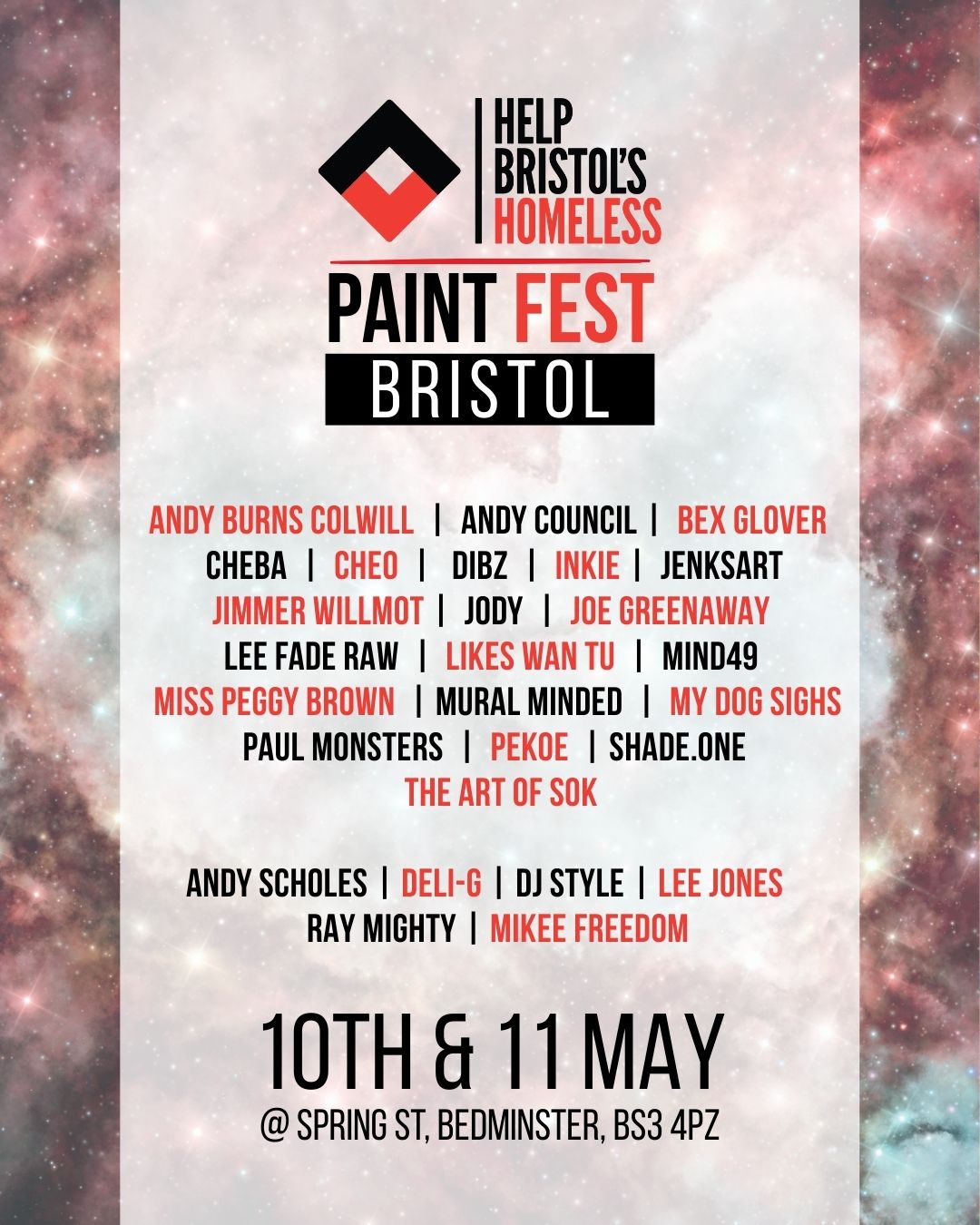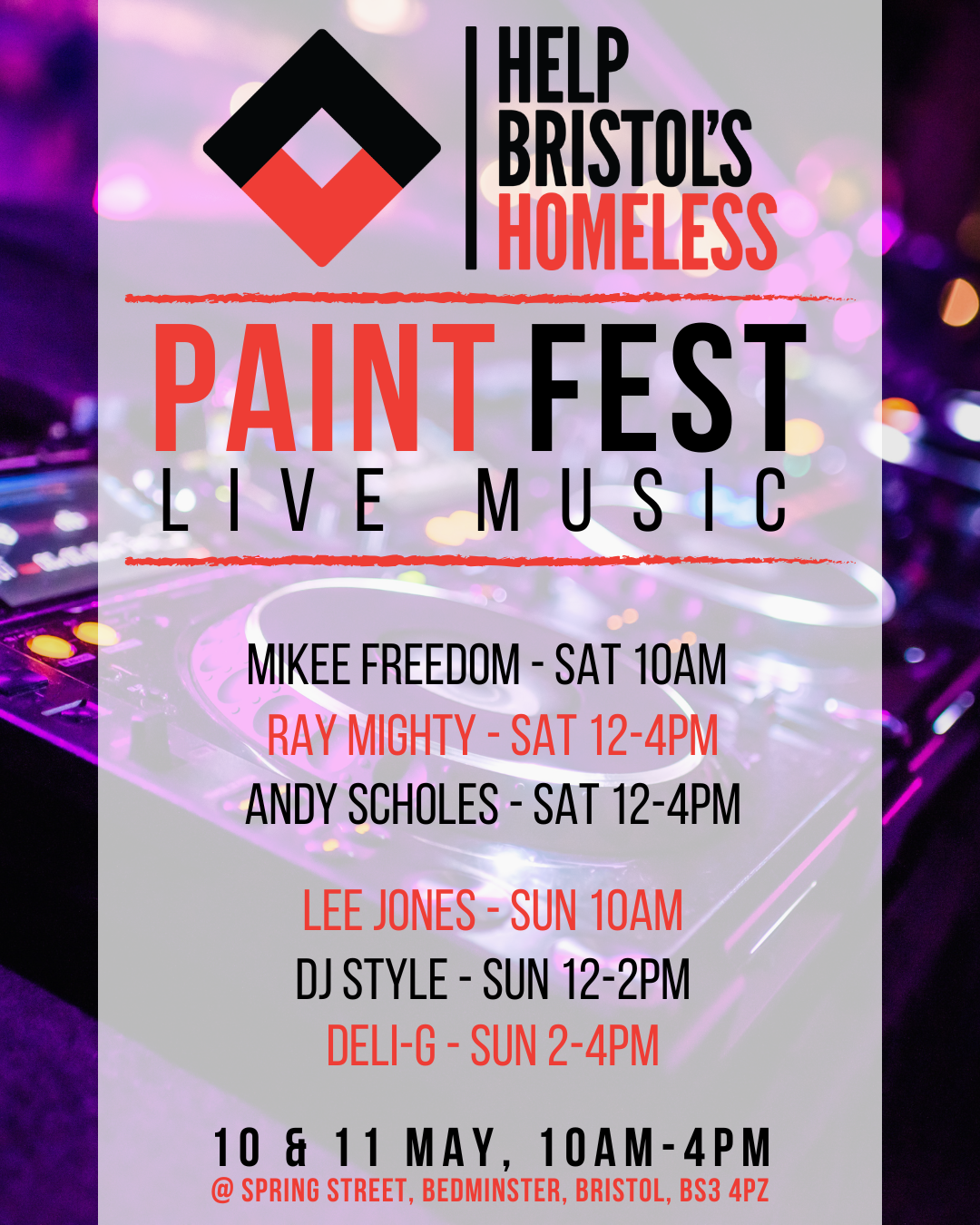 Help Bristol’s Homeless will be hosting its very own Paint Festival on Sat 10th and Sun 11th May 2025! Come and witness incredible artists in action as they transform our space into a vibrant canvas. Plus music from some DJ’s around the city, a fun-filled day of painting, music, & food. For info visit the Eventbrite link below. EVENTBRITE