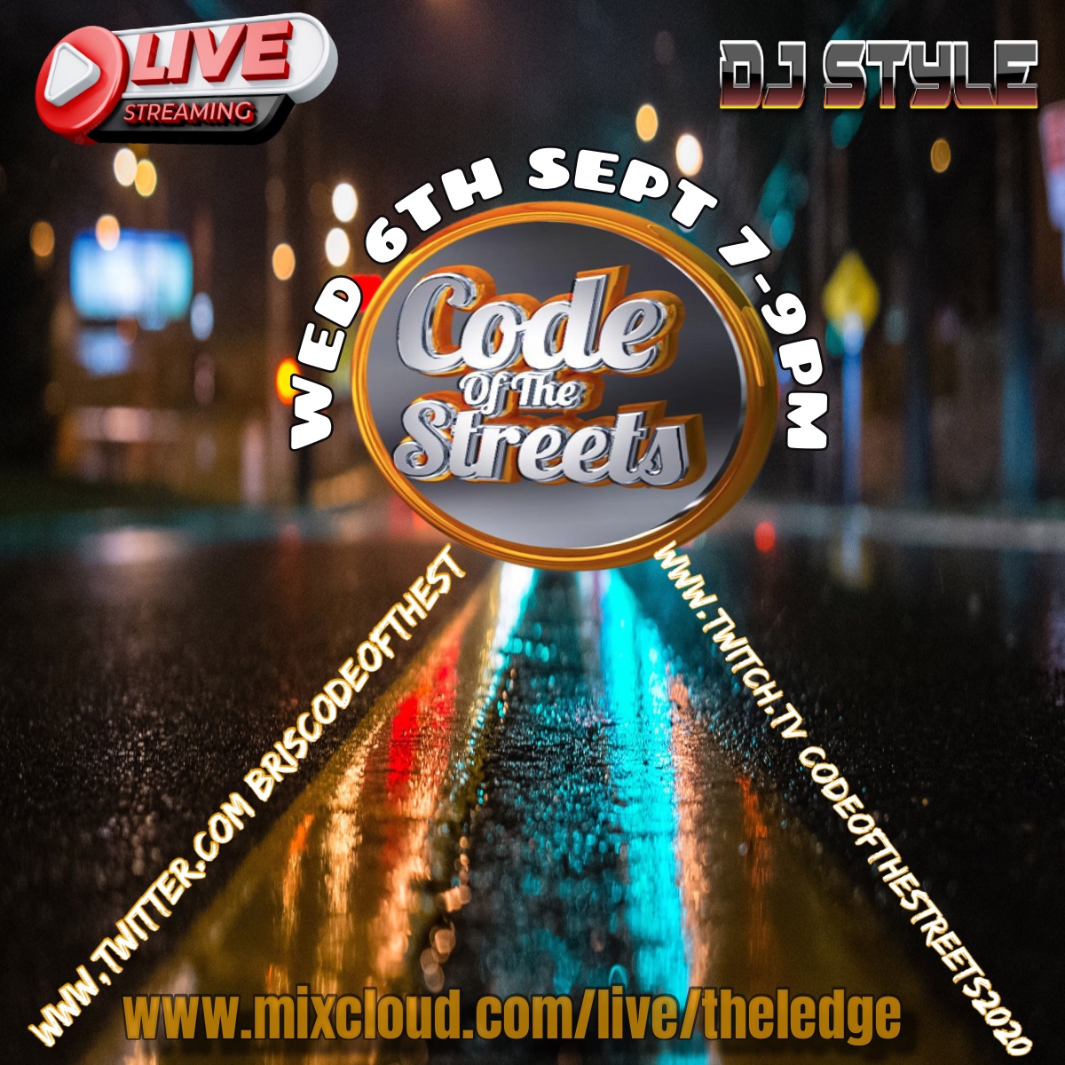 We’re back tonight with the Midweek Jam Wed 6th Sept live-streaming 7-9pm, broadcasting live from https://twitter.com/BriscodeoftheSt http://www.twitch.tv/codeofthestreets2020 – www.mixcloud.com/live/theledge – www.facebook.com/djstylebig