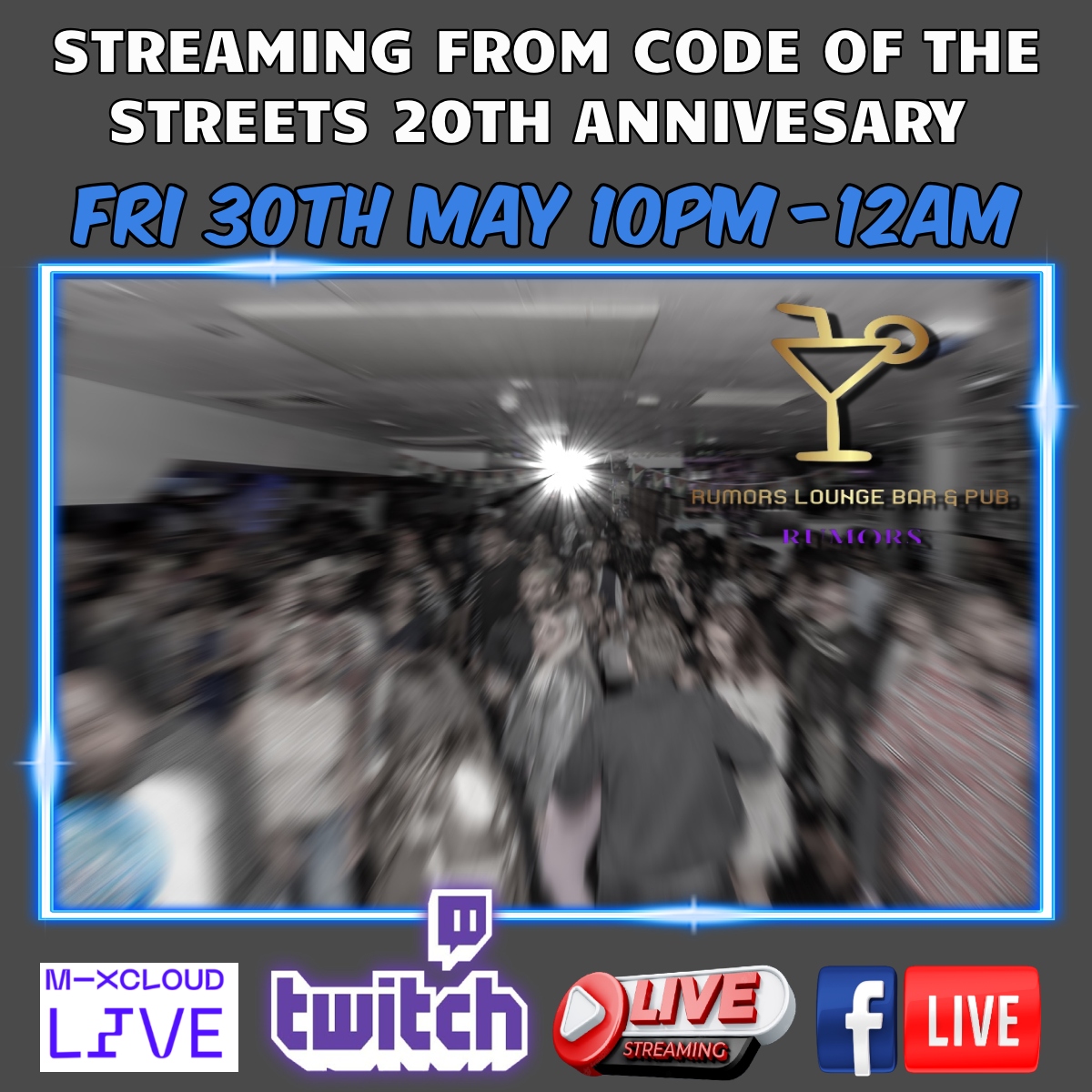 Later tonight 10pm -12am we will be restreaming Code of the Streets 20th Anniversary from last weekend @ Rumours Lounge & Bar. Watch back from the following platforms: Mixcloud – Twitch Facebook