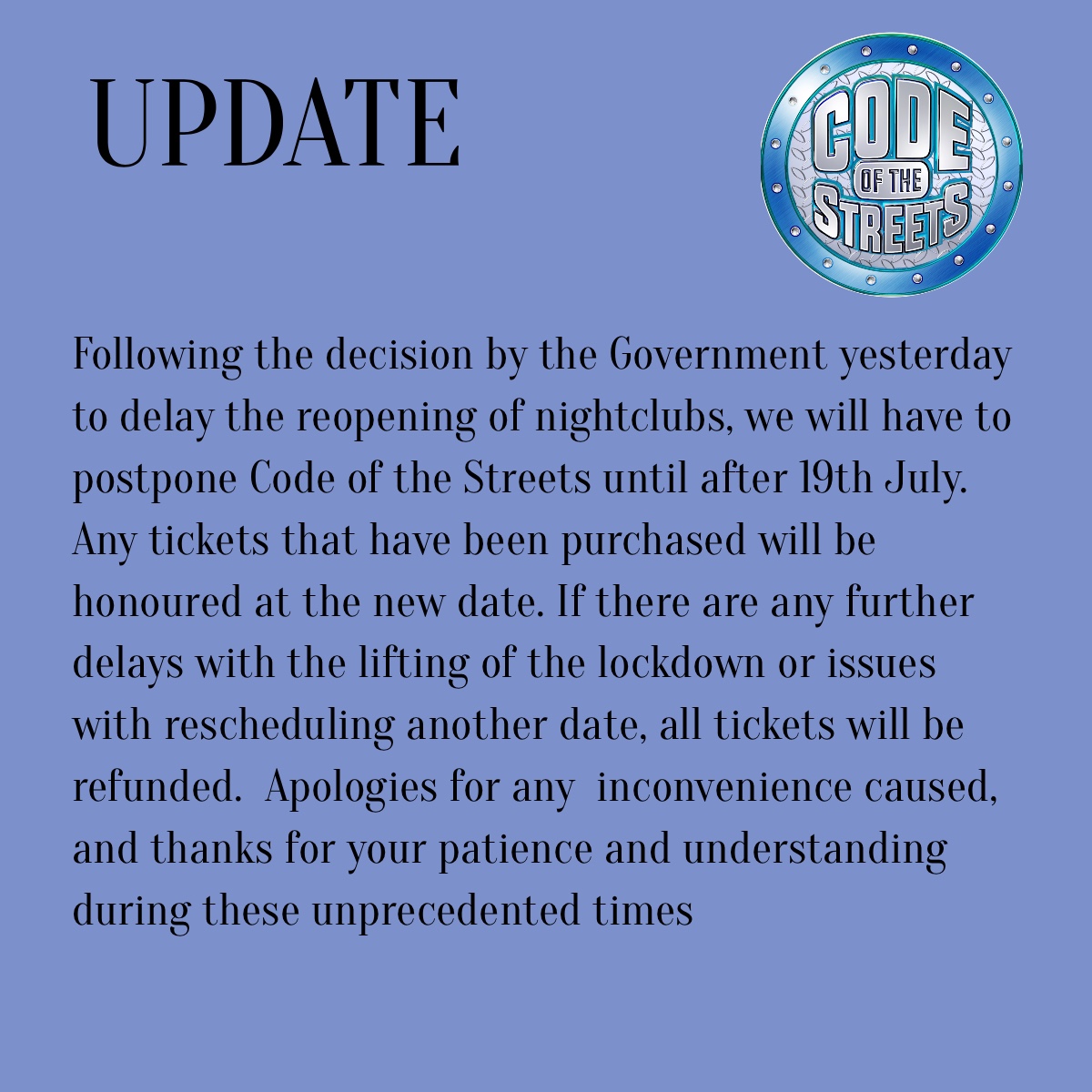With the release of The Early Bird Tickets for Code of the Streets Sat 17th July plus the launch of the online shop, we will be marking these two event with a livestream. Join us live from page to find out who our Special Guest will be on the night.