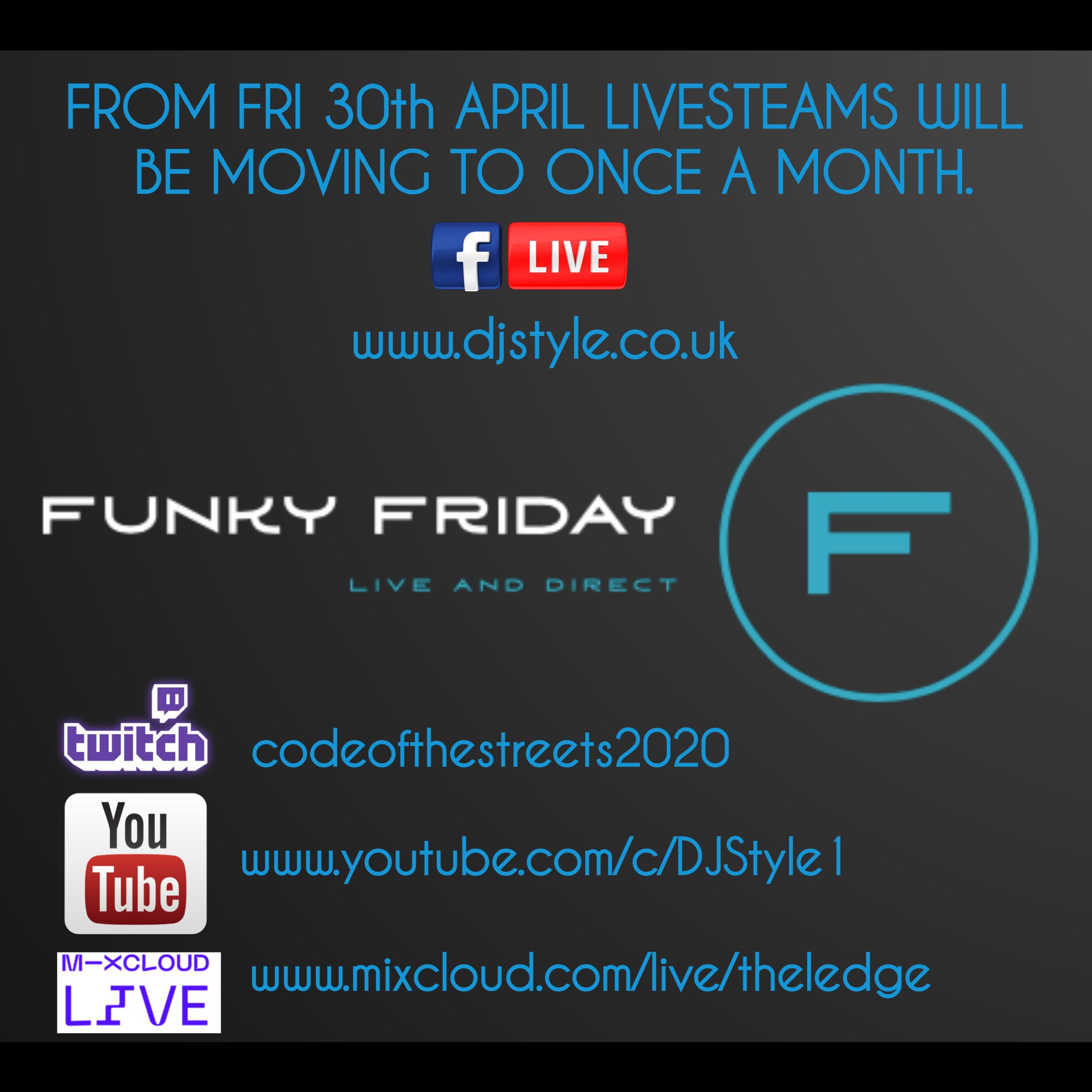 For almost 3 months, Funky Friday has been steaming live weekly on Mixcloud, Twitch, Facebook, Youtube as well as boadcasting live from this site as well.