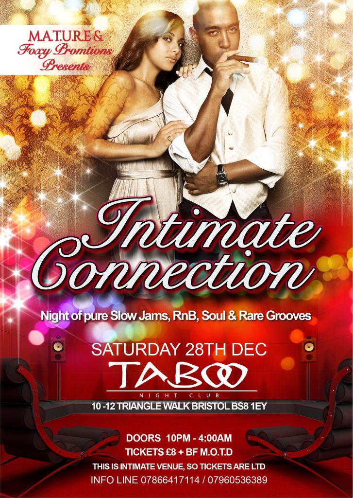 Following a big interest on Facebook after a number of positive post for a night specialising in Slow Jams – RnB – Soul & Rare Grooves, it’s with delight we can announced it’s here ‘Intimate Connection’. This will take place on Sat 28th Dec 2019 @ Taboo Night Club 10 -12 Triangle Walk Clifton Bristol BS8 1EY, doors 10pm -4am.