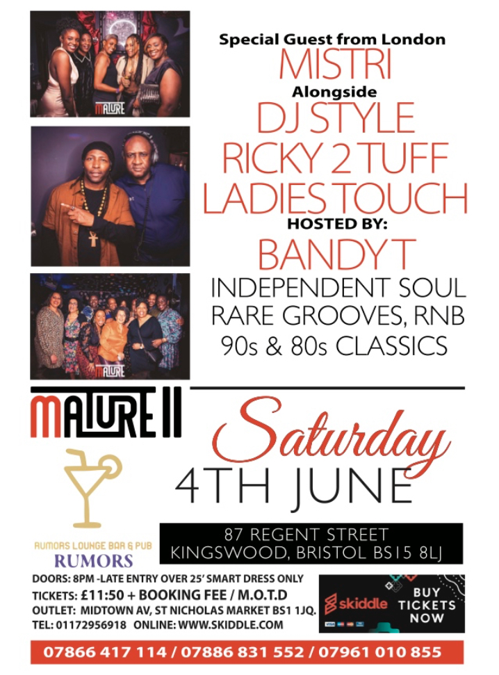The biggest Old School Party on The Jubilee Weekend, MATURE Pt. 2 returns on Sat 4th June @ Rumors Lounge & Bar, 87 Regent St, Kingswood, Bristol BS15 8LJ. Tickets available from Midtown Av St Nicholas Market BS2 1JQ, online skiddle.com/e/36064587.