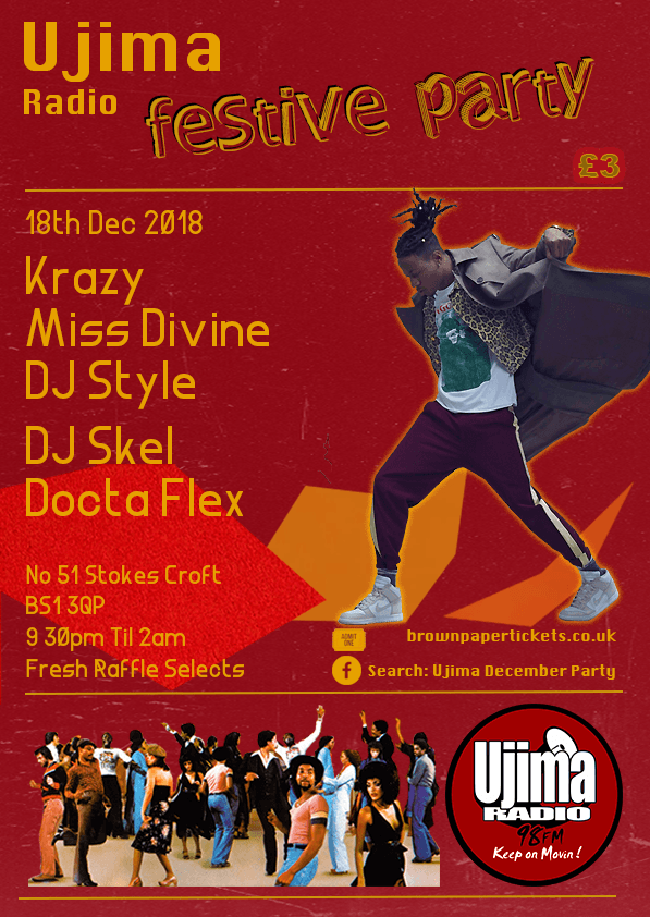 The annual Ujima December Party Takes place on Tues 18th Dec No. 51 Stokes Croft Stokes Croft. Meet some of your favourite on air personalties and DJ’s, tickets only £3 in advance from this link https://bit.ly/2P0jF0k
